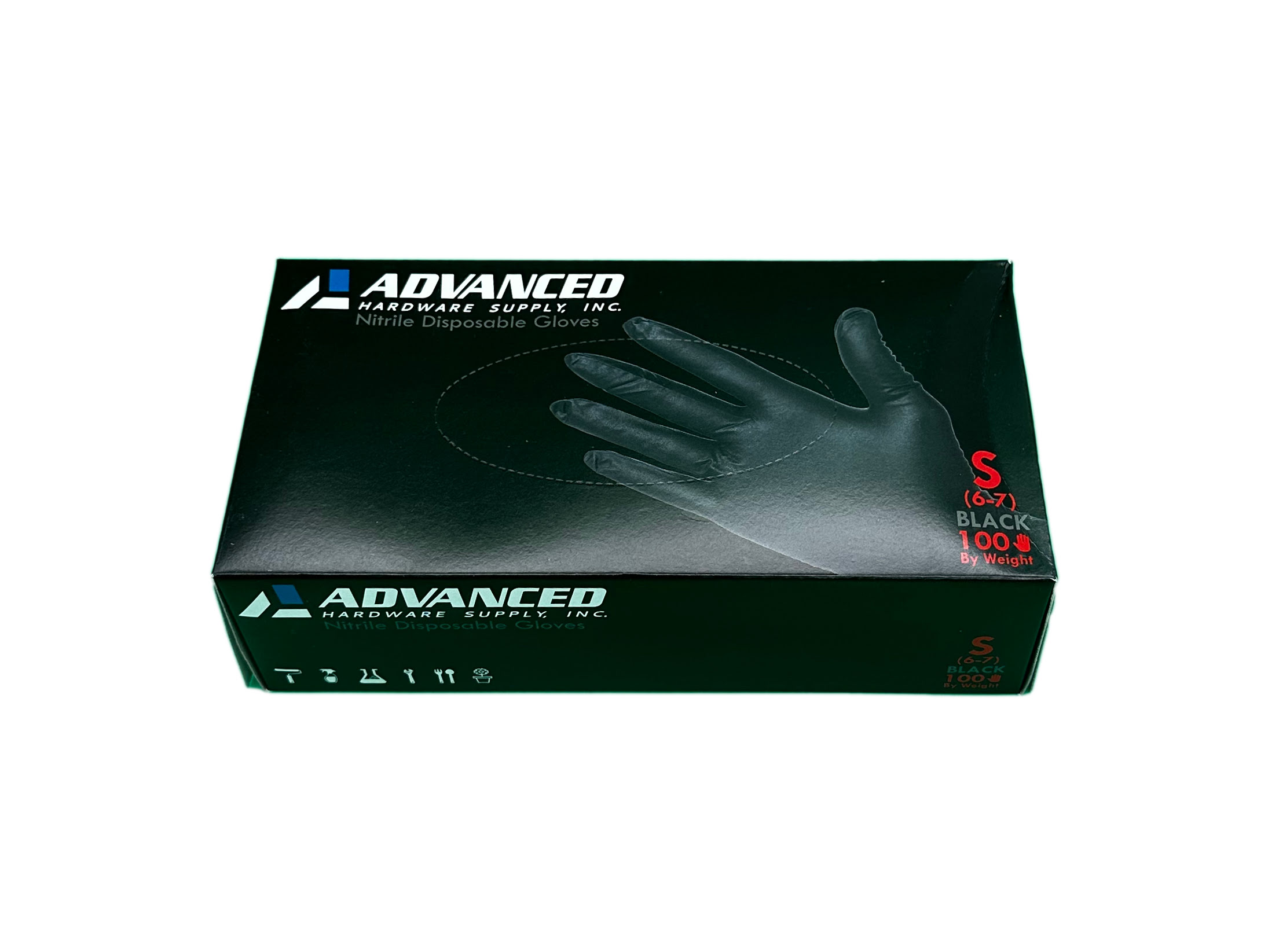 Advanced Hardware Supply, Inc. Brand black nitrile gloves.