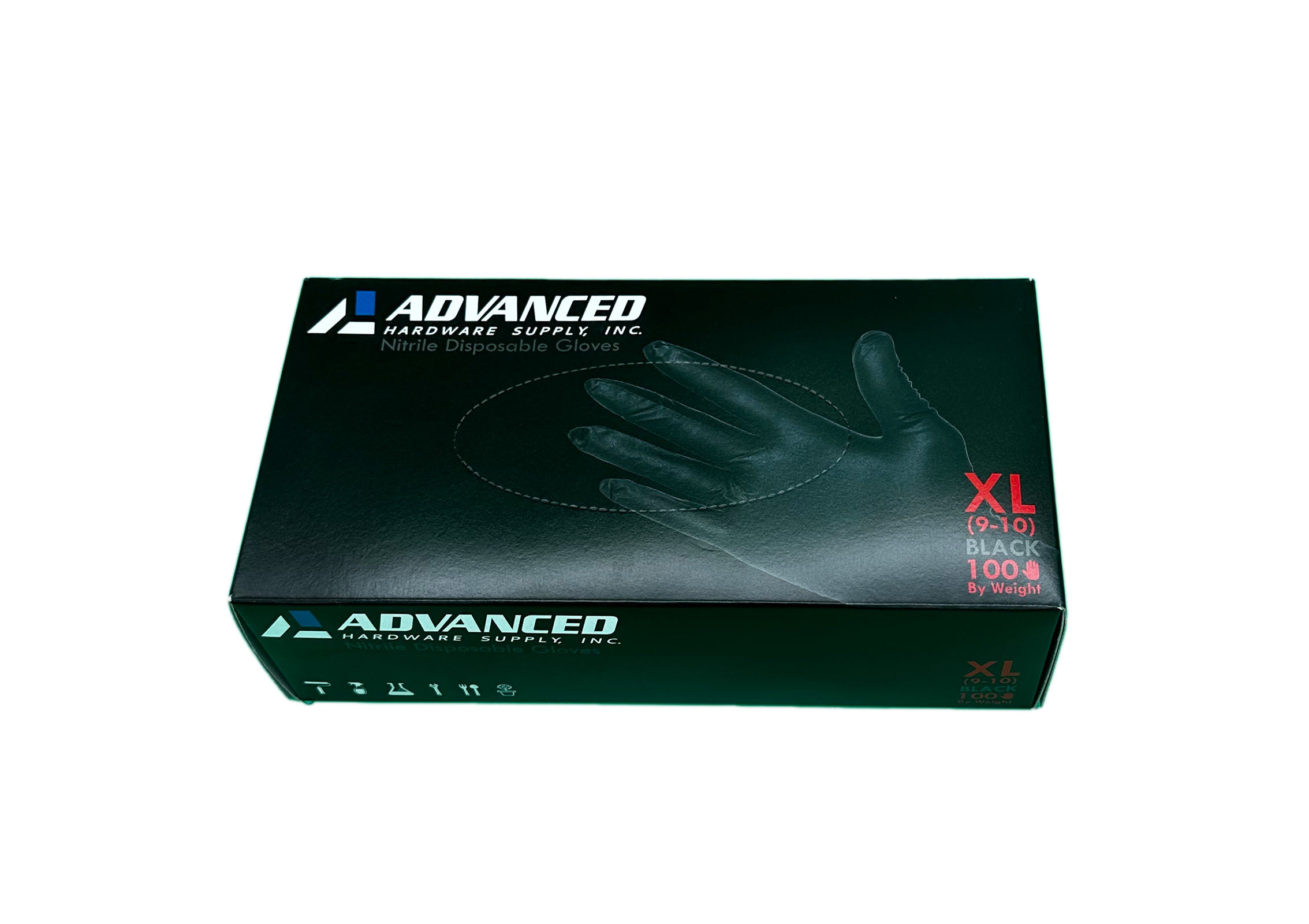 Advanced Hardware Supply, Inc. Brand black nitrile gloves.
