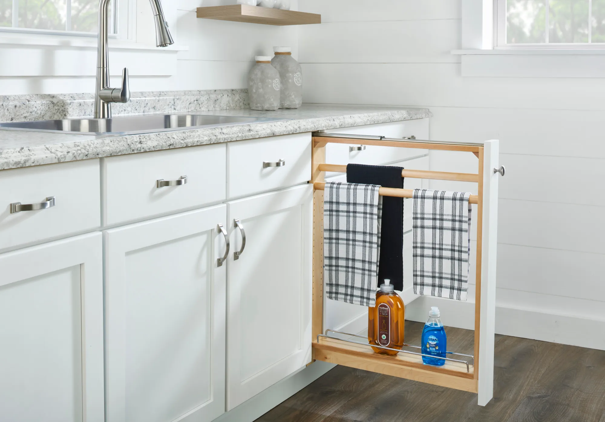 SKU: 275050Are you looking for a better way to store hand towels and cleaning supplies in the kitchen? Look no further than the new 432TB Series Filler Organizer, featuring natural maple construction, full-extension, ball-bearing slides with soft-close, two towel bars and a static shelf with chrome wire accents.