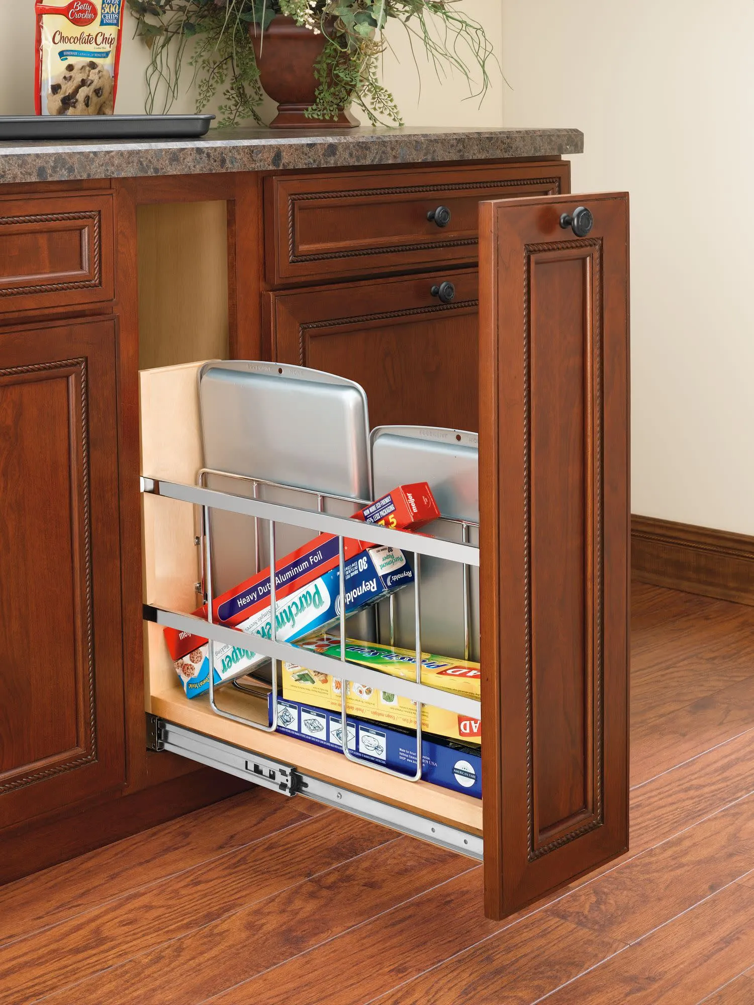 SKU: 275078Rev-A-Shelf’s baking storage has never been more versatile than with the 447 Pullout Organizer. These organizers feature compartments for storing baking sheets and platters and the removable center racks allow you the ability to store large platters and bake ware if desired.