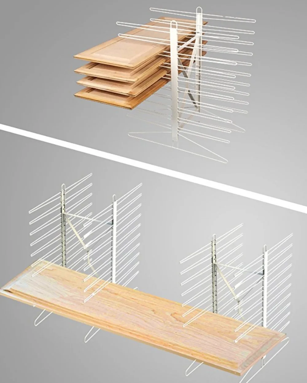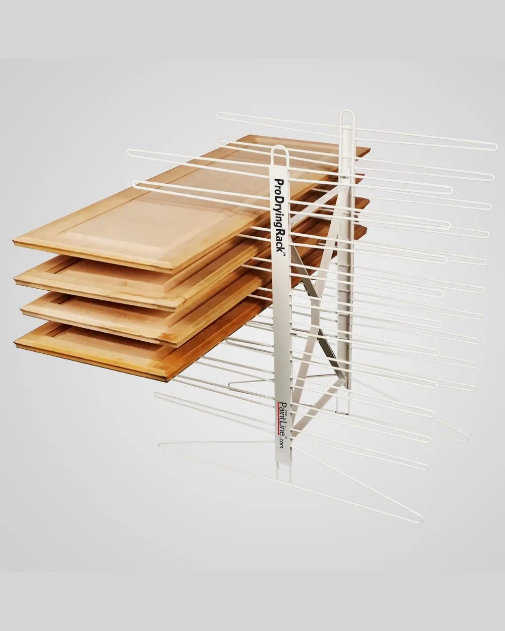 SKU: 196005Econo cabinet door drying rack. Think of it as the little brother to the flagship drying rack, the PDRTT holds 20 cabinet doors up to 25 lbs each. Position on the counter, on a table or just on the floor to make the most of your work space. String 2 together and hold long parts such as crown molding or baseboard. Stores flat and features near “brains optional” assembly with just 4 wing nuts. Perfect for DIYers and professionals alike.