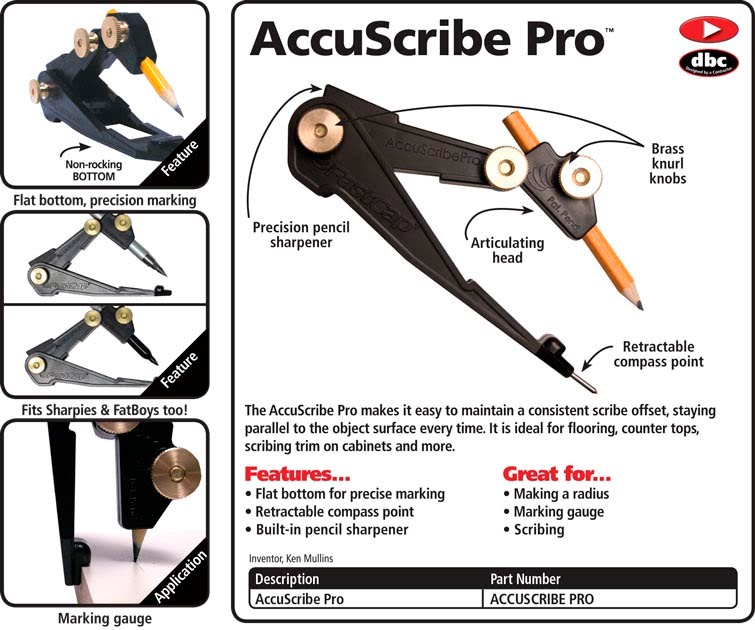 It is ideal for scribing trim on kitchen cabinets, architectural moldings, countertops, splash guards, tile and even flooring. Fits a standard pencil, Sharpie, or FatBoy Pencil.
