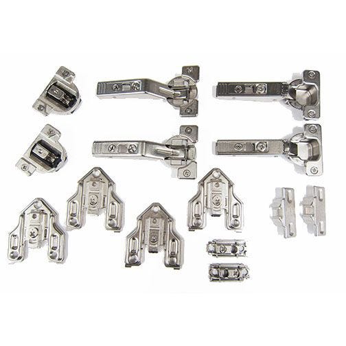 Set includes: Mounting plate for lever for large overlay 5-piece doors (qty 2) COMPACT 33 free swing hinge (qty 2). CLIP mounting plate; face frame (qty 2). COMPACT 33 mounting plate; 1-1/4″ overlay (qty 2). CLIP top center hinge (qty 2)