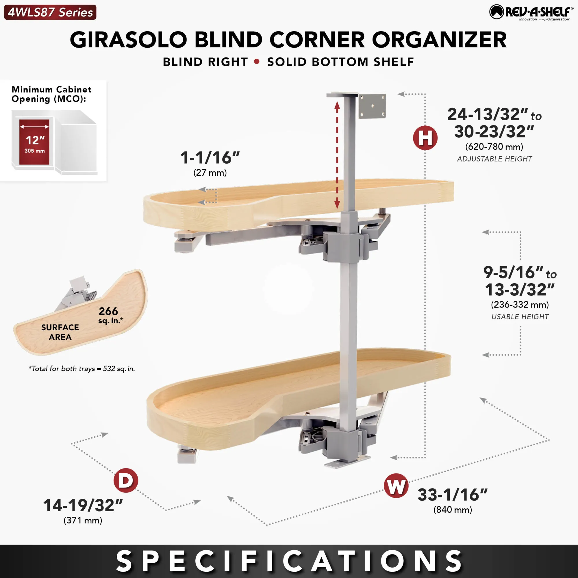 SKU: 275363The 4WLS87 Series “Girasolo” Blind Corner Optimizer by Rev-A-Shelf® is the perfect solution for the dark abyss that can be a blind corner cabinet. This innovative design features two pullout trays that easily glide directly out on a soft-close pivot hardware system, eliminating the need for adjacent appliance clearance. The adjustable shelving system also allows for maximum storage capacity, while optimizing the usage of the hard-to-reach storage area.