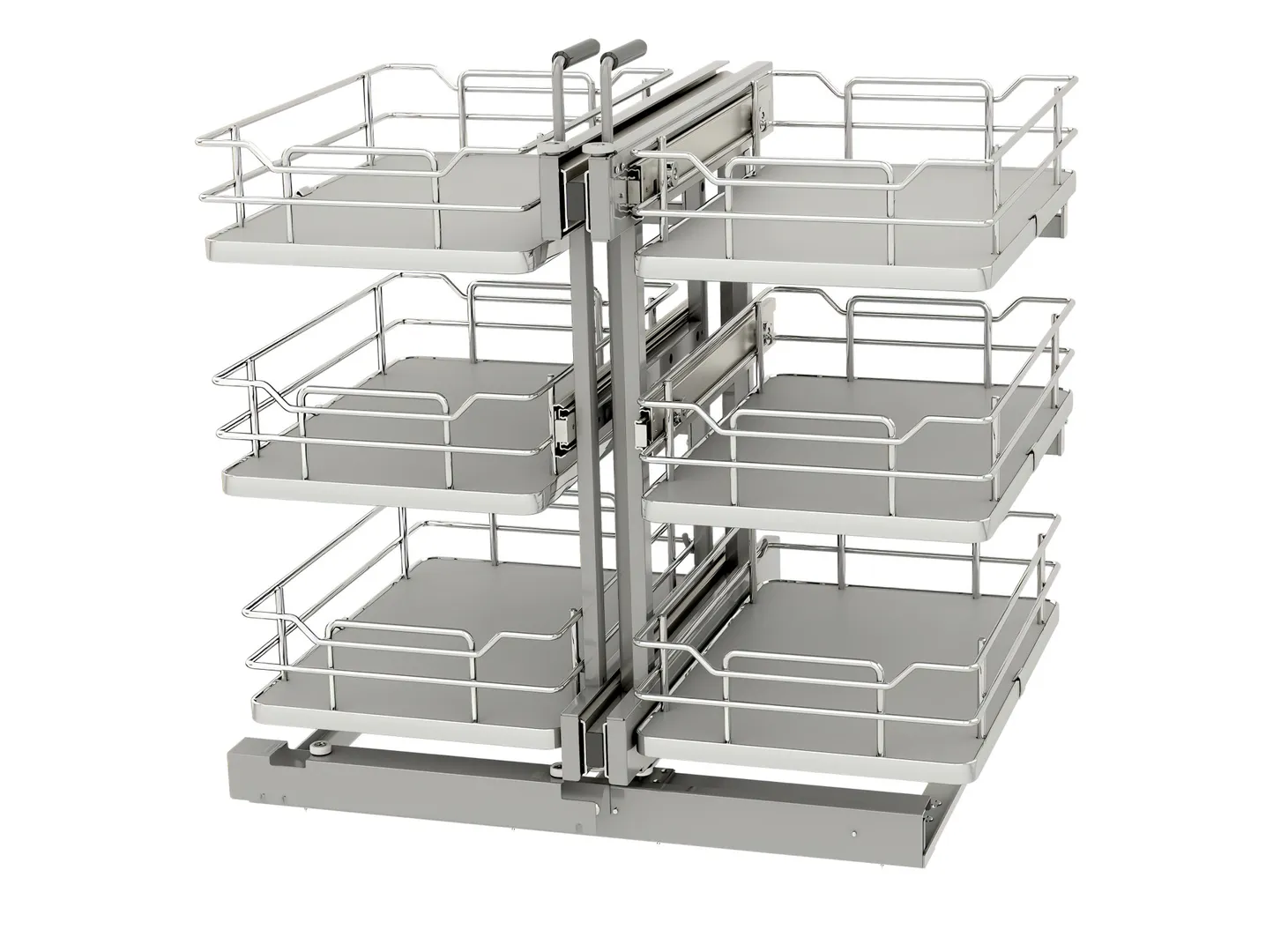 This cabinet accessory takes functionality to the next level with top shelves that slide independently from the lower shelves. This two or three-tier organizer comes with solid bottom construction in your choice of natural maple, gray or orion gray. The non-handed design installs in either left or right-handed blind corner applications.