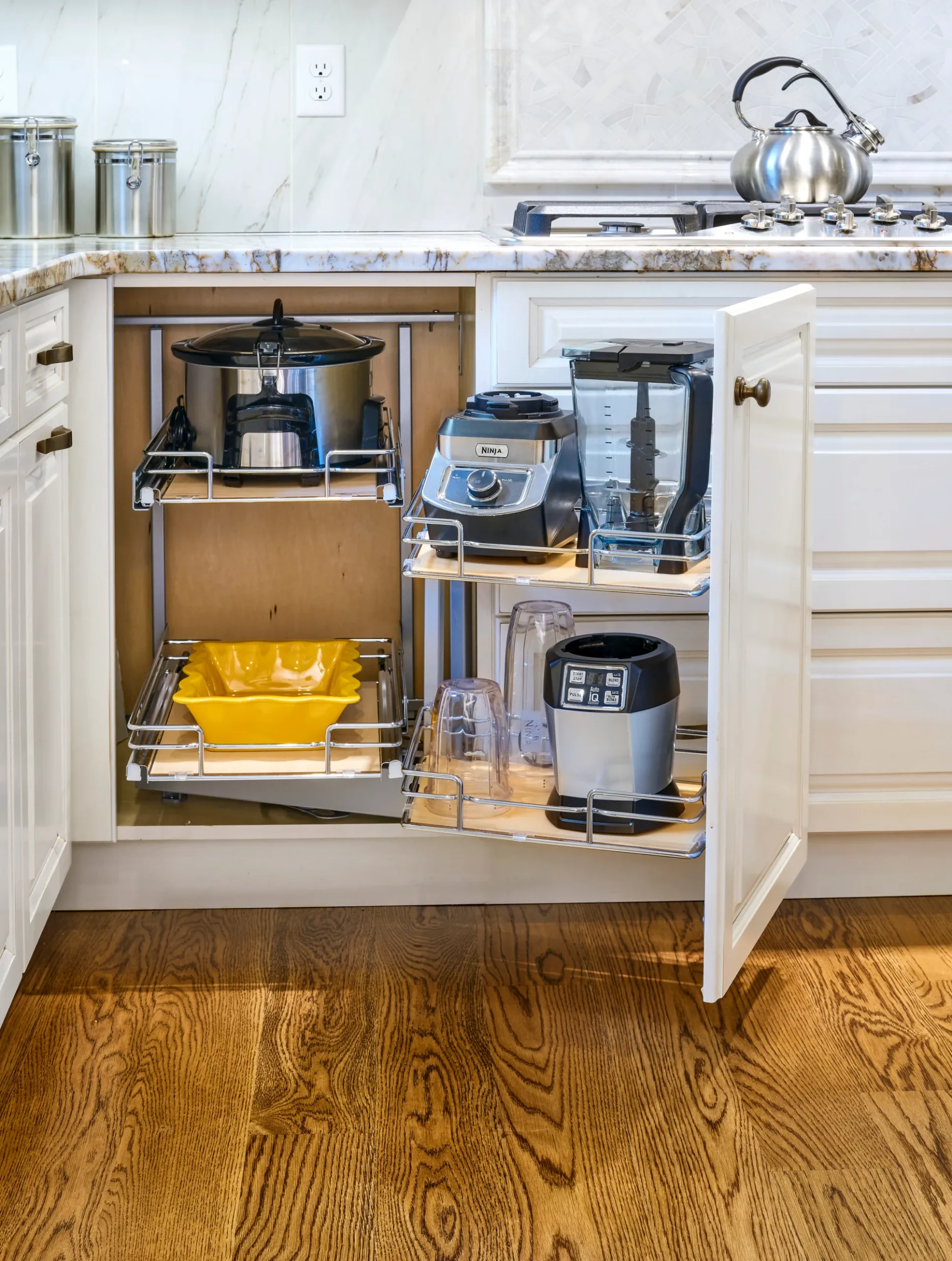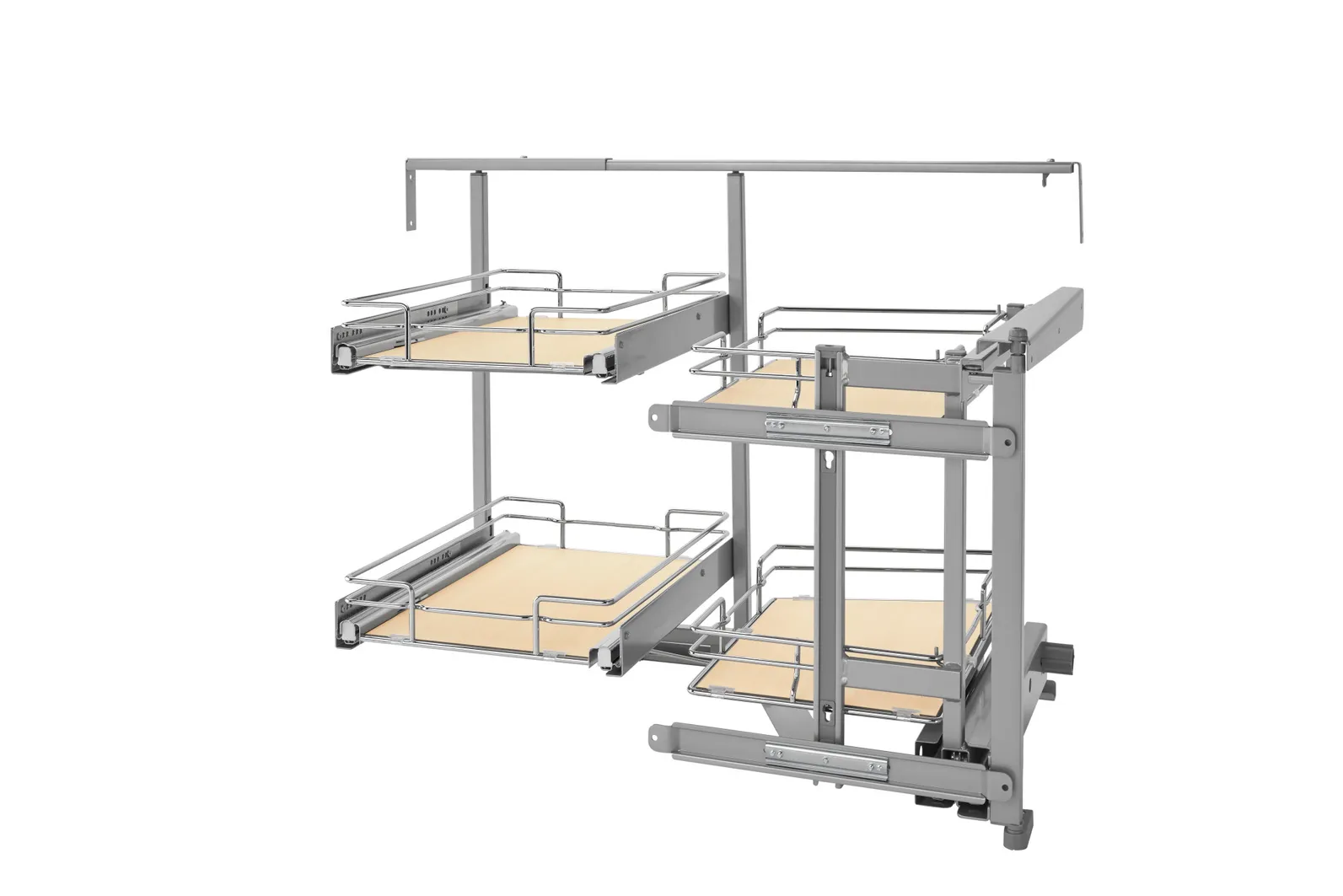 Optimize your storage with this luxurious blind corner organizer. As you pull open the cabinet door the front baskets slide & rotate out of the cabinet while the rear baskets move into sight. Each rear basket can then be independently pulled open allowing full access to those hard to reach items